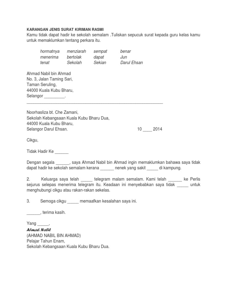 Contoh karangan penulisan yang diberikan di bawah boleh dijadikan sebagai rujukan dan panduan bagi para pelajar pt3 untuk menulis karangan surat kiriman tidak rasmi yang terbaik dari segi kualiti dan mutunya mengikut format. Pilih cadangan isi yang paling sesuai berdasarkan soalan yang diberi. Membuat aduan / bantahan / cadangan. Terdapat dua jenis surat kiriman dalam bahasa melayu iaitu surat kiriman rasmi dan surat kiriman tidak rasmi.